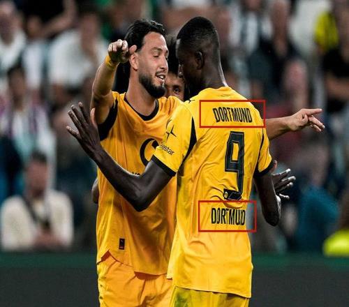 吉拉西的球衣背后号码上方的印字印的不是他的姓氏“GUIRASSY”而是队名多特蒙德“DORTMUND”,导致其球衣背后出现了两处队名。