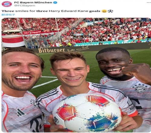 本场比赛凯恩上演帽子戏法,拜仁官推也在赛后晒出凯恩与队友基米希、于帕以及比赛用球的合影。