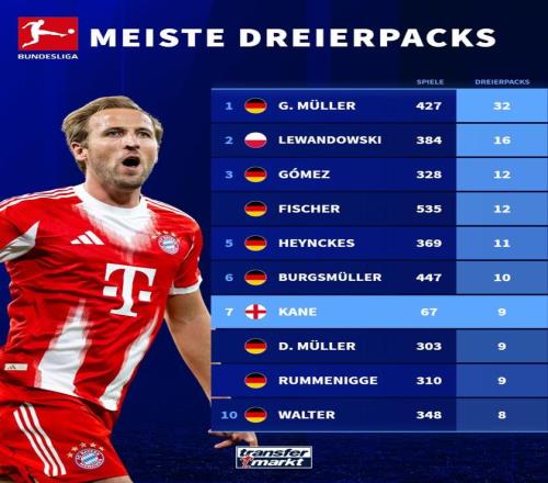 榜首由传奇射手盖德·穆勒占据,他在427场比赛中完成32次帽子戏法,波兰前锋莱万以16次排名第二。排在第三和第四位的是戈麦斯与菲舍尔,均完成12次。