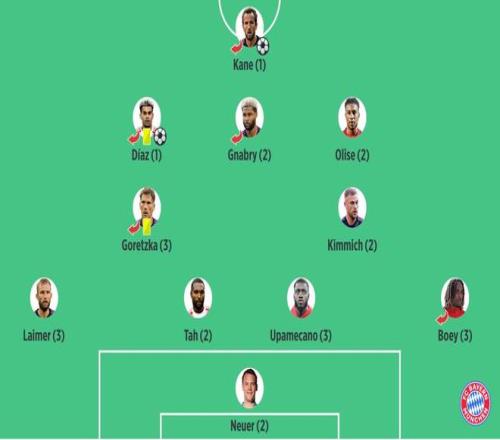 诺伊尔(2分);博埃(3分)、于帕梅卡诺(3分)、约纳坦-塔(2分)、莱默尔(3分);基米希(2分)、格雷茨卡(3分);奥利塞(2分)、格纳布里(2分)、路易斯-迪亚斯(1分);哈里-凯恩(1分)