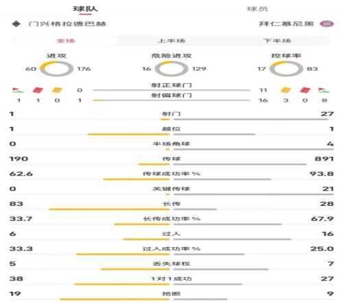 门兴vs拜仁全场主要数据对比: