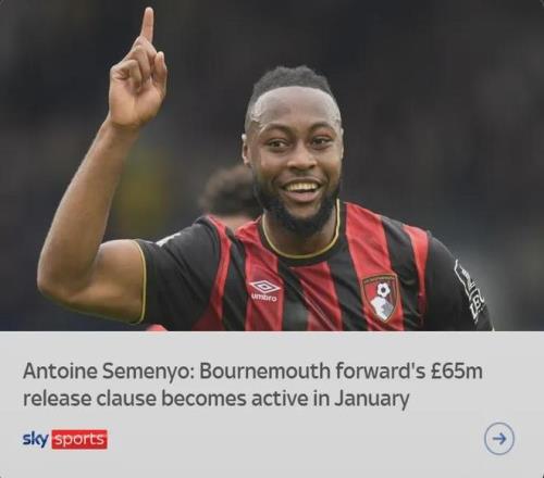 TA记者DO发文报道了同样的消息,他声称塞梅约的违约金条款可以在一月份特定的日期激活(对任何球队都有效),这样伯恩茅斯将有时间寻找替代者,而夏天时6500万英镑的违约金将下调。