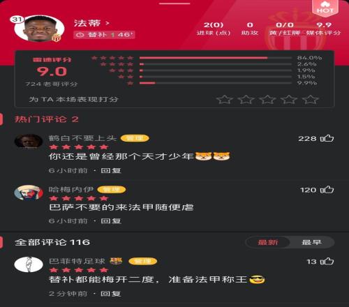 本场比赛,法蒂迎来法甲首秀,83分钟完成梅开二度,帮助摩纳哥5-2大胜梅斯。摩纳哥联赛开局4胜1负,暂列积分榜第二。