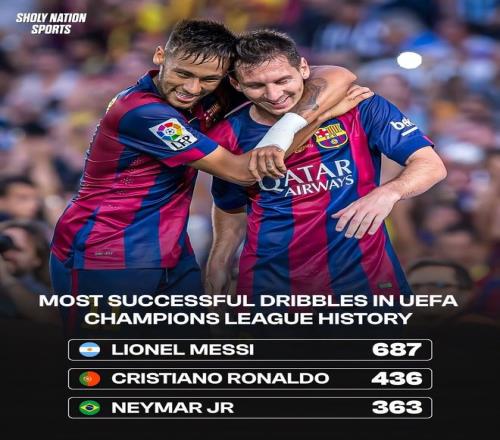 此外,梅西还有欧冠历史上最精彩的进球,而且是官方认证。这个进球就是2011年,梅西面对皇马的从中场开始单挑皇马整条后防线、进球。布斯克茨的世纪助攻就在这场比赛出现。梅西还有其他历史第一的数据。比如媒体SNS就统计并公布了欧冠历史上过人榜,其中梅西独一档,有687次。C罗第二,436次,内马尔第三363次。