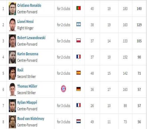 凭借这2粒进球,姆巴佩在欧冠已经打入57粒进球,在欧冠历史射手榜上的排名超过了荷兰传奇前锋范尼(56球),与穆勒并列成为欧冠历史射手榜第6位。