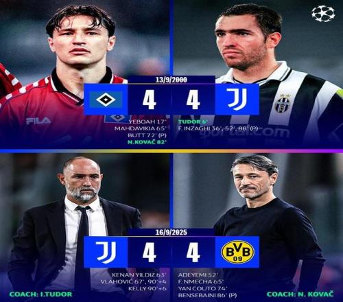 赛后根据统计,尤文上一次在欧冠的比赛中与对手踢成4-4还要追溯到25年前,巧合的是当时他们的对手也是一支德国球队。2000年9月13日尤文在欧冠第一阶段小组赛第一轮的比赛中客场与汉堡踢成了4-4。更为巧合的是,当时图多尔和尼科-科瓦奇分别为尤文以及汉堡取得了进球。
