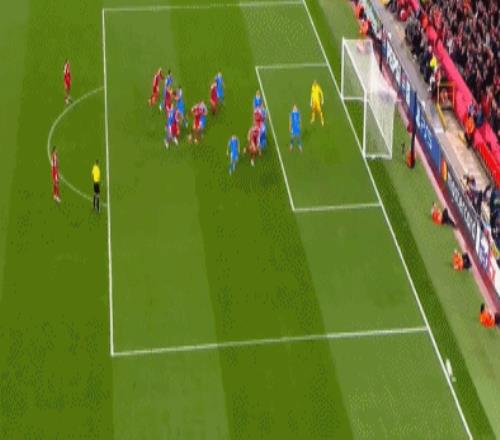 萨拉赫处理禁区外的直接任意球,一脚贴地箭击中罗伯逊,打了奥布拉克一个措手不及,1-0!