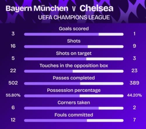 欧冠联赛阶段首轮,拜仁和切尔西狭路相逢。上半场特雷沃·查洛巴自摆乌龙,莫伊塞斯·凯塞多送点,凯恩点射破门,帕尔默迅速扳回一城。下半场凯恩再次取得进球,帮助拜仁在主场3比1力克切尔西。