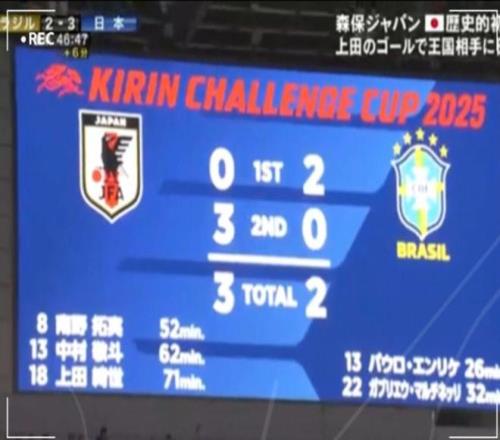 当比赛才进行到71分钟的时候,日本队就3-2反超了。此时,日本官方电视台提前宣布比赛结束,打出了“日本队首次战胜五星巴西”的字幕。最终,日本队没有让他们的电视台被打脸,守住了3-2的胜果。