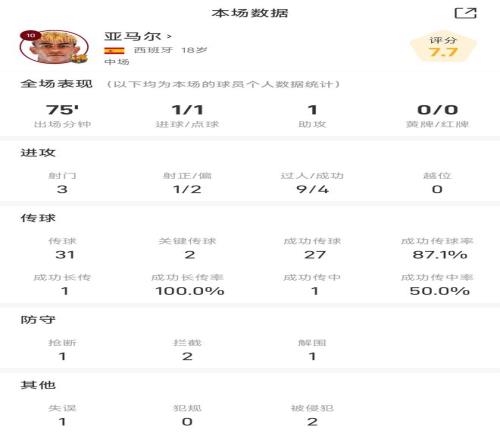 雷速体育10月22日宣 在今天凌晨进行的巴萨主场对阵奥林匹亚科斯的欧冠比赛中,亚马尔首发出场助攻费尔明首开纪录并打入1记点球。