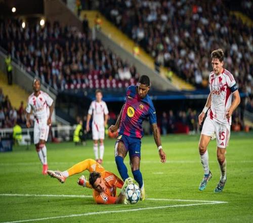10月21日,巴塞罗那队球员拉什福德(右)和队友庆祝得分。新华社发(胡安·戈萨摄)