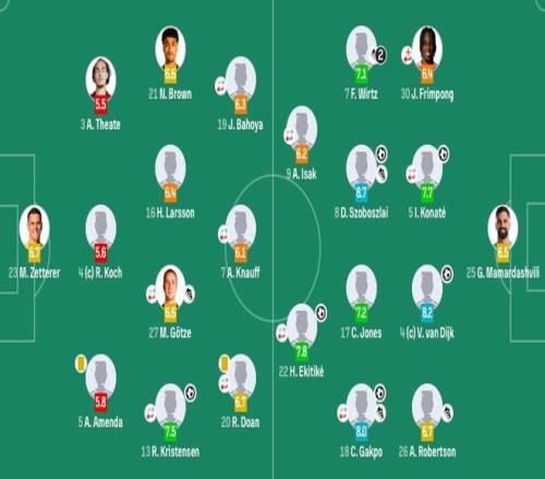 法兰克福首发:23-泽特尔、3-泰特、4-科赫、5-阿曼达、13-克里斯滕森(59'34-科林斯)、21-布朗、16-拉尔森、27-格策(64'8-沙伊比)、7-克瑙夫(76'15-斯希里)、19-巴霍亚(59'9-伯卡特)、20-堂安律(64'42-乌尊)