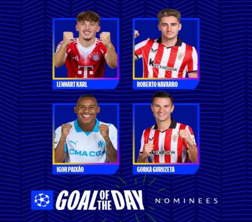 北京时间10月23日,在欧冠联赛阶段第3轮的第二个比赛日结束后,欧冠官方列出了今日比赛最佳进球的四个候选者,拜仁慕尼黑的伦纳特-卡尔、马赛的派尚以及毕尔巴鄂竞技的罗伯特-纳瓦罗和古鲁泽塔入围。