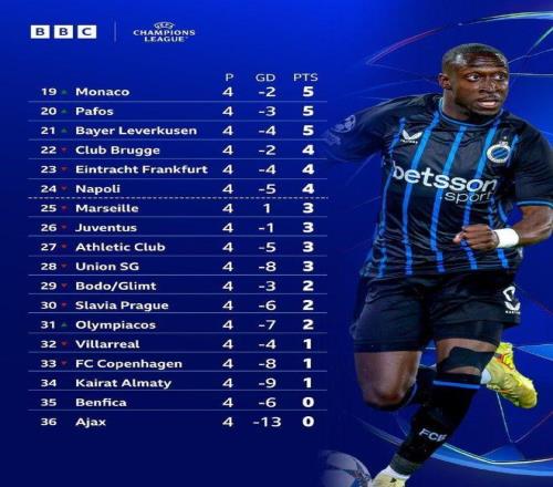 目前4轮战罢,仍有2队至今1分未得。还是两支前赛会冠军,穆帅执教的本菲卡主场0-1不敌勒沃库森,阿贾克斯则是0-3溃败给加拉塔萨雷,4轮0分后,两队晋级附加赛的希望相当渺茫。
