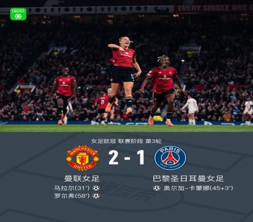 北京时间11月13日女足欧冠 联赛阶段 第3轮,曼联女足对阵巴黎圣日耳曼女足。曼联女足马拉尔破门,罗尔弗破门。巴黎圣日耳曼女足奥尔加-卡蒙娜破门。最终比分曼联女足 2-1 巴黎圣日耳曼女足。曼联女足取得女足欧冠的三连胜,同时送给巴黎女足3连败。