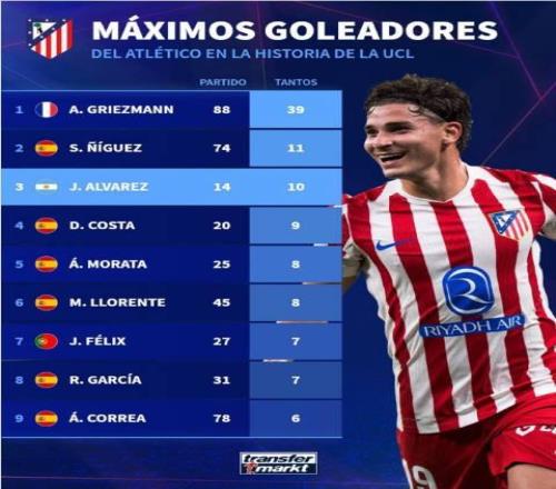 根据统计, 阿尔瓦雷斯已经代表马竞在欧冠中打进了10粒进球,位列队史欧冠进球榜第三名。