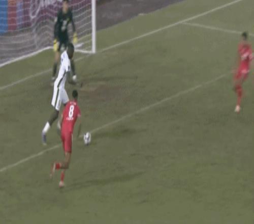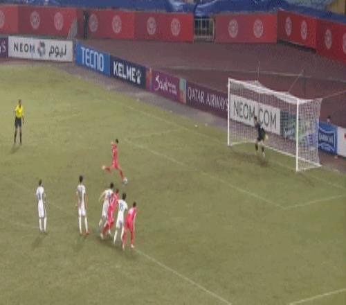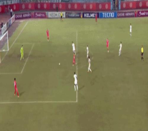 第74分钟,张玉宁单刀突入禁区低射被门将挡出,张玉宁右脚吊射击中横梁。
