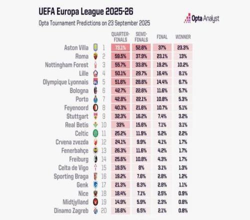 北京时间9月23日,在新赛季欧联杯即将打响的情况下,Opta的超级计算机预测了参赛球员的夺冠概率,阿斯顿维拉以23.3%的夺冠概率排名第一,罗马13%排名第二,诺丁汉森林10.2%排名第三。