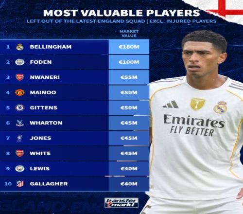 雷速体育10月3日宣 英格兰队公布了新一期大名单,德转盘点了落选本次英格兰大名单的球员身价榜单(不含伤病球员)。