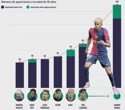 国际职业足球运动员联合会(FIFPRO)最新发布的球员工作量报告,用数据印证了许多人的担忧。亚马尔正是典型例子。年仅18岁的他,已代表巴萨出战130场职业比赛,累计登场时间达9772分钟,这一数据几乎是伊涅斯塔、哈维、法布雷加斯同年龄段时的两倍。与曾被视为赛事负荷过高典型的贝林厄姆相比,亚马尔18岁时的出场时间还要多出31%。