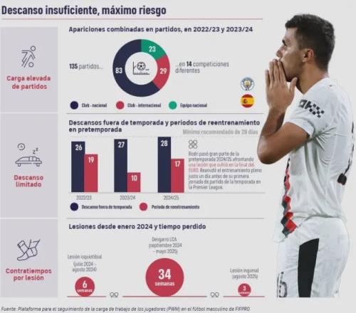 曼城中场罗德里的遭遇则勾勒出球员伤病的恶性循环。在2022-24两个赛季中,他共出战135场比赛,远超专家建议的年均55场的安全阈值。2024年欧洲杯决赛后,罗德里遭遇腘绳肌损伤,几乎没有休赛期便仓促回归,完全没有留出康复时间。几周后,他的十字韧带撕裂,不得不缺席235天比赛。