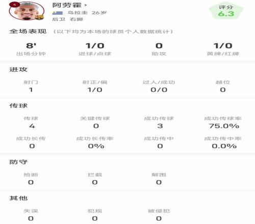 统计显示,阿劳霍本场比赛上场8分钟,1次射门,打入1球。