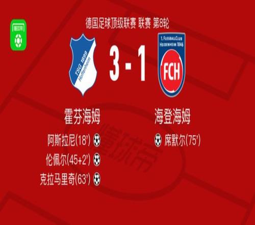 北京时间10月25日德国足球顶级联赛 联赛 第8轮,霍芬海姆主场对阵海登海姆。霍芬海姆阿斯拉尼破门,伦佩尔破门,克拉马里奇破门。海登海姆席默尔破门。最终比分霍芬海姆 3-1 海登海姆。