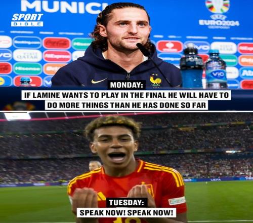 当时17岁的亚马尔在欧洲杯半决赛前,面对法国中场拉比奥的挑衅言论,在社媒发出了著名的“将死对手后在说话”。随后他在这场半决赛中打入精彩世界波,帮助西班牙晋级决赛并拿到了冠军,当时的亚马尔因“拿球说话”这一行为圈粉无数。