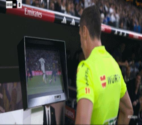 下半场刚开始,贝林厄姆突入禁区,与巴萨后卫埃里克·加西亚发生接触后倒地。主裁判未予理会,判给皇马角球。VAR再次介入,提示防守球员存在手球犯规。主裁经视频回看后,果断改判点球。