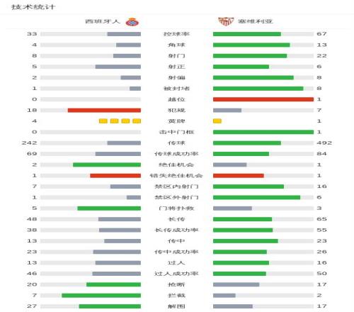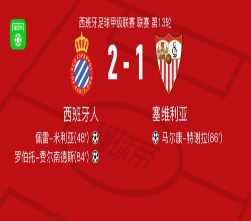 北京时间11月25日,西班牙足球甲级联赛第13轮展开角逐,西班牙人坐镇主场迎战塞维利亚。比赛中,西班牙人率先打破僵局,佩雷-米利亚接多兰的助攻后破门得分,为主队取得领先。随后,乌尔科-冈萨雷斯送出助攻,罗伯托-费尔南德斯冷静施射建功,进一步扩大比分优势。临近比赛尾声,塞维利亚由加布里埃尔-苏亚索助攻马尔康-特谢拉扳回一球,但未能扭转局势。最终,西班牙人以2比1战胜塞维利亚,全取三分。