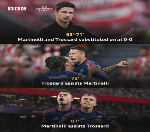 北京时间9月17日,欧冠联赛阶段第1轮,阿森纳客场2-0击败毕尔巴鄂竞技,成为第一支欧冠对阵西班牙球队取得6连胜的球队。本场比赛,阿尔特塔的换人决定了比赛走势。下半场替补登场的马丁内利、特罗萨德互送助攻,帮助枪手2-0击败毕尔巴鄂竞技。当埃泽与马杜埃凯首发却陷入沉寂时,两位“老面孔”及时站了出来,枪手恐怖的阵容厚度在这一刻得到了完美体现。
