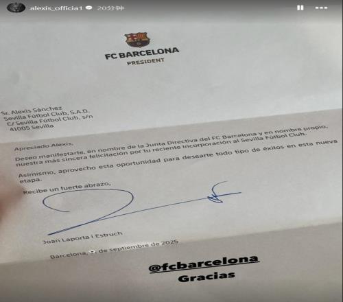直播吧09月23日宣 36岁的智利前锋、巴萨旧将桑切斯今夏回归西甲加盟塞维利亚。今天他更新社媒,展示了一封老东家巴萨发来的贺信。信中大致写道: