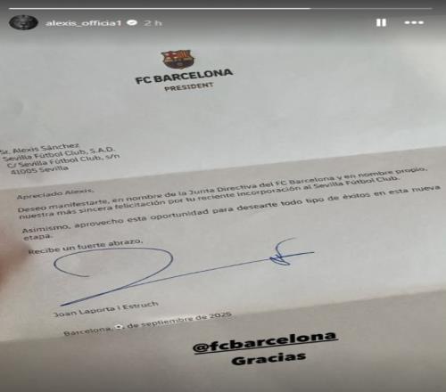 这位智利前锋曾在2011-12至2013-14赛季为巴萨效力,共计出场141次,打入41球,在由拉波尔塔签名的信中,俱乐部祝愿他在转会塞维利亚后取得成功。