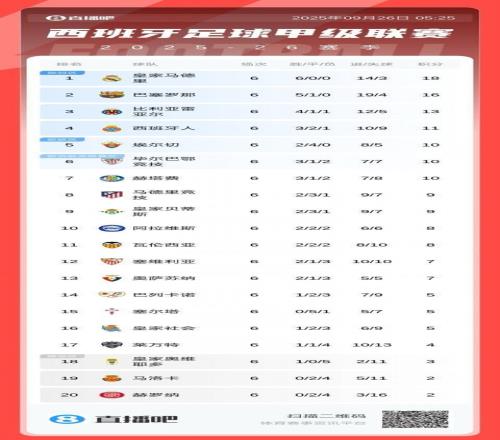 直播吧09月26日宣 西甲第6轮,巴塞罗那客场3-1逆转皇家奥维耶多,本场过后的西甲积分榜情况如图所示。