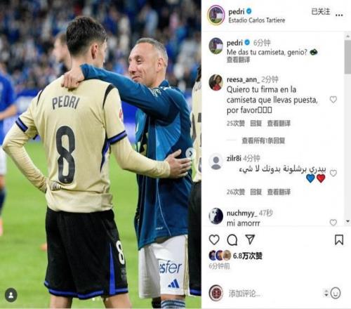 巴萨中场佩德里更新社媒动态,晒出与皇家奥维耶多40岁中场卡索拉的赛后合照,对其表达敬意,配文:“天才,能把你的球衣给我吗?”