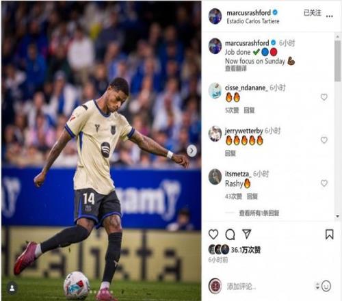 拉什福德社媒晒出比赛照片,配文:“任务完成,现在专注于周日的比赛(对阵皇家社会)。”