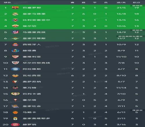 北京时间9月29日,西甲第7轮又结束了两场对决,我们一起看看最新积分榜变动,主要的信息如下:巴萨2-1战胜皇家社会,继续保持不败金身,以19分反超18分的皇马登顶榜首,皇家贝蒂斯主场2-0战胜奥萨苏纳暂列第6名。