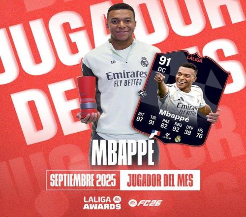 姆巴佩被评为9月份的月度最佳球员,该奖项由LALIGA与EA合作颁发,这位法国球员在本月表现出色,成为皇家马德里进攻中的关键球员,在本赛季的7场西甲比赛中赢得了6场胜利。