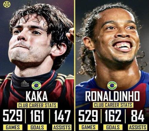 卡卡场均G+A为0.58,明显高于罗纳尔迪尼奥的0.47;助攻147比84占优,进球基本持平(161vs162)。