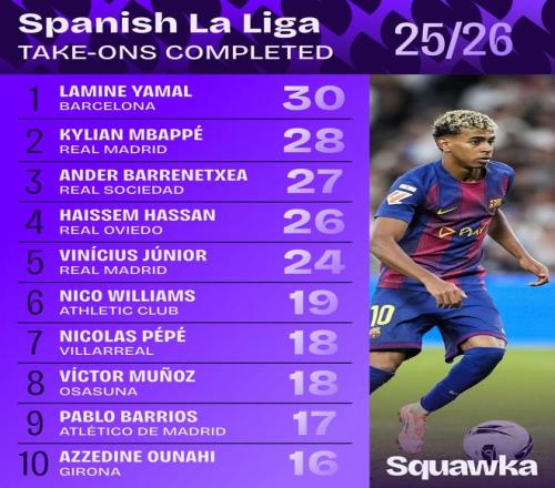 北京时间10月29日,知名数据平台Squawka列出了本赛季西甲联赛中完成过人次数最多的球员榜单,巴萨球星亚马尔30次居首,皇马球星姆巴佩28次紧随其后,皇家社会球员巴雷内切亚27次位居第三。
