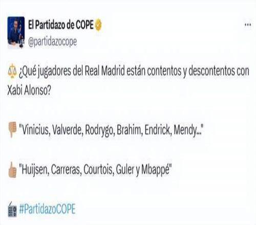 西甲第13轮,皇马2-2战平埃尔切,各项赛事3场不胜,西甲领先优势缩水为1分。11月25日,COPE电台名记阿兰查在Partidazo节目中,揭秘皇马更衣室的派系分布。有不少球员对主帅阿隆索不满意,但也有姆巴佩这样的支持者。