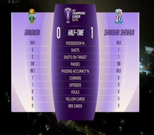 半场比赛结束前,特谢拉接高天意的直塞后,左路内切破门。这也是上海申花半场唯一一次射门,就取得了进球。而江原FC则是5脚射门2脚射正。