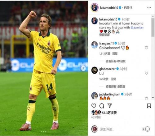 莫德里奇社媒晒出比赛照片,并写道:“在主场取得重要胜利!很高兴攻入我在米兰的首粒进球。”