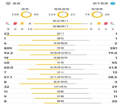控球率方面,曼城达到74%,那不勒斯则为26%。角球数量,曼城9-2遥遥领先。进攻次数方面,曼城158-45;至于危险进攻次数,曼城则124-21。