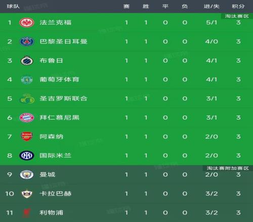 北京时间9月19日,欧冠第一轮最后6场比赛结束,我们一起看看最新积分榜变动,主要的信息如下:曼城2-1那不勒斯,巴萨2-1纽卡斯尔联,布鲁日4-1摩纳哥,勒沃库森2-2哥本哈根、葡萄牙体育4-1阿拉木图凯拉特,法兰克福5-1加拉塔萨雷!