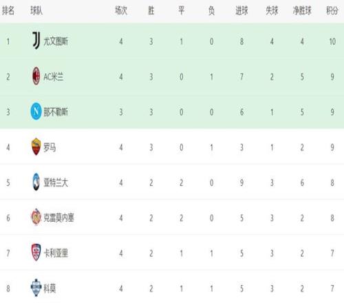 在积分榜上,尤文图斯3胜1平拿到10分排名榜首。AC米兰以9分排名第2。那不勒斯和罗马也都是9分,排名第3和第4名。不过,那不勒斯少踢1场,3场全胜。亚特兰大和克雷莫内塞都是8个积分。国际米兰2胜2负,只拿到6分,排名第10。拉齐奥只拿到3分,排名第13。