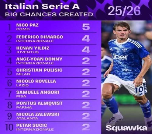 直播吧9月26日宣 知名足球数据网站Squawka统计了2025/26赛季意甲联赛截至目前的球员创造重大机会榜。