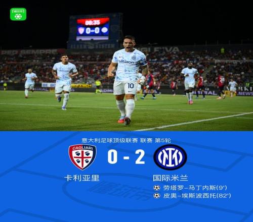 北京时间9月28日,意甲联赛第5轮,卡利亚里坐镇主场迎战国际米兰。上半场,巴斯托尼传中,劳塔罗头球破门。下半场,迪马尔科传球,皮奥-埃斯波西托收获个人意甲处子球。全场比赛结束,国米客场2-0战胜卡利亚里。