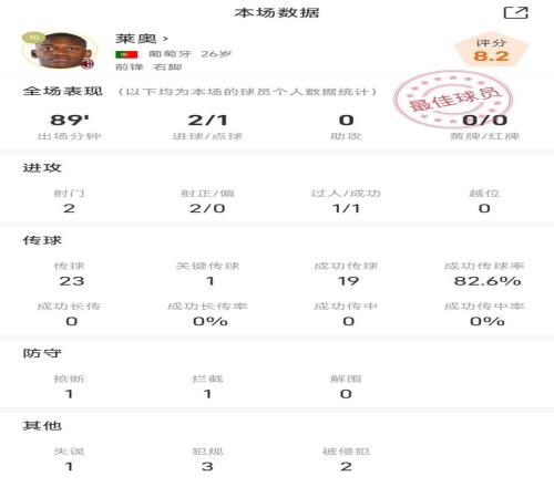 莱奥战佛罗伦萨全场数据: