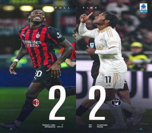 虽然米兰第7分钟就早早取得领先,但此后一直没能扩大比分优势。第60分钟,德温特禁区内手球送点,夸德拉多主罚命中扳平比分。第86分钟,阿金桑米罗中场送出精准长传,恩佐拉单刀射门反超比分。不过,米兰在补时第3分钟由小将阿特卡梅打进绝平球,为这场跌宕起伏的比赛剧情划上了句号。